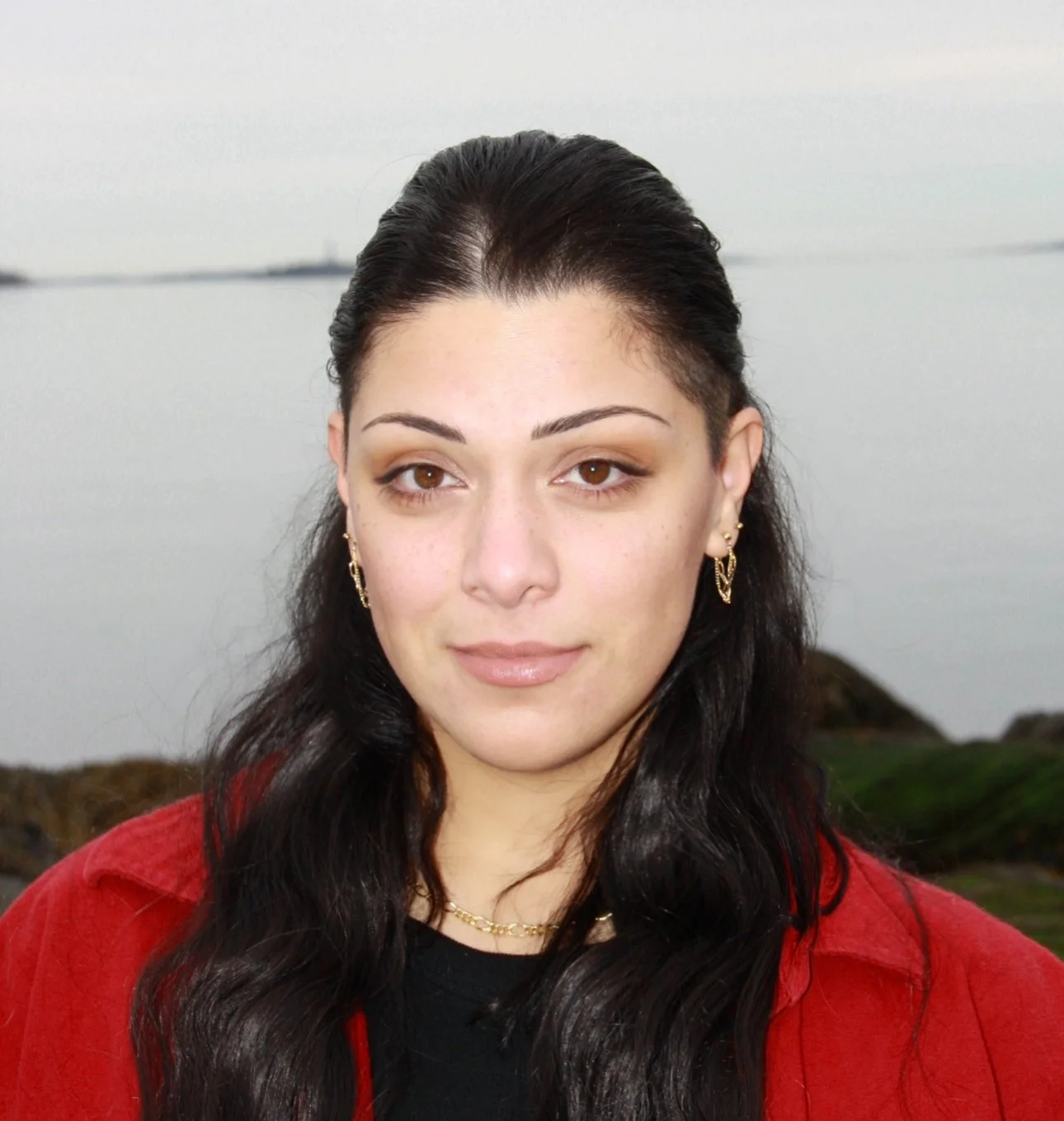 Image description: Portrait of a woman with long dark hair wearing a red jacket and gold earrings, standing outdoors near a body of water under soft, overcast light.