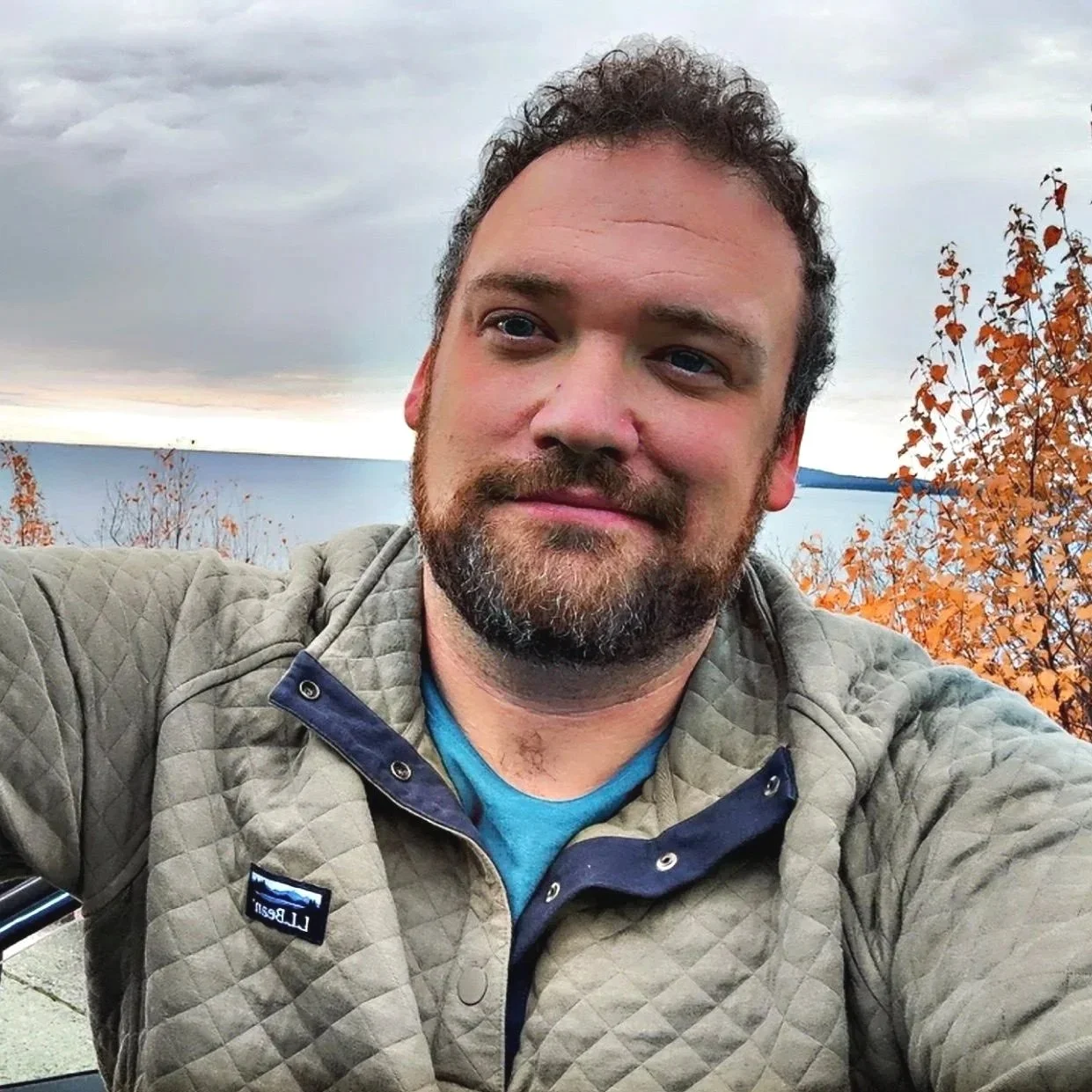 Image Description: Portrait of a man with short curly hair and a beard wearing a quilted jacket, standing outdoors near a body of water with autumn trees and a cloudy sky in the background.