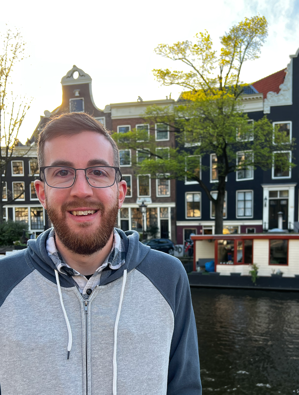 Image Description: A photograph of Max wearing a dark and light gray sweatshirt stands in front of a canal and storefronts. He has dark, parted hair, a friendly smile, and is wearing glasses.