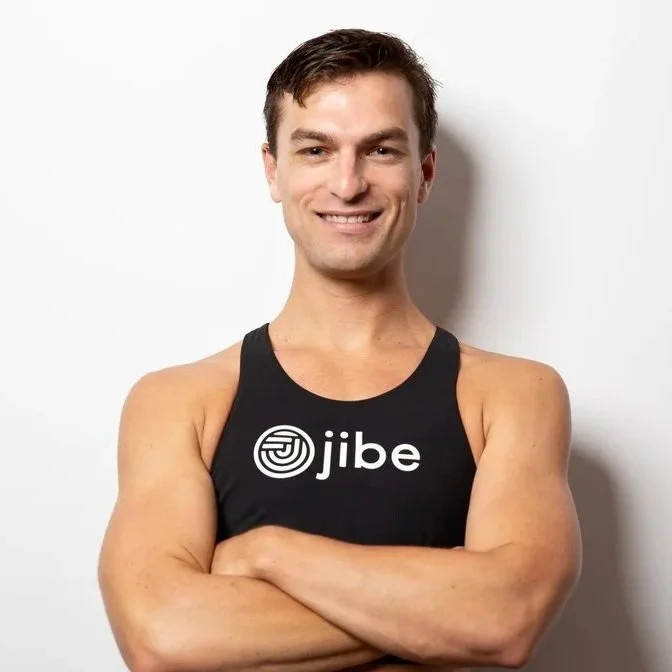 Image Description: A photograph of Tanner Skilton, a man in his 30’s with dark brown short hair and a friendly smile. He is wearing a black tank top with the word “jibe” and a circular logo.