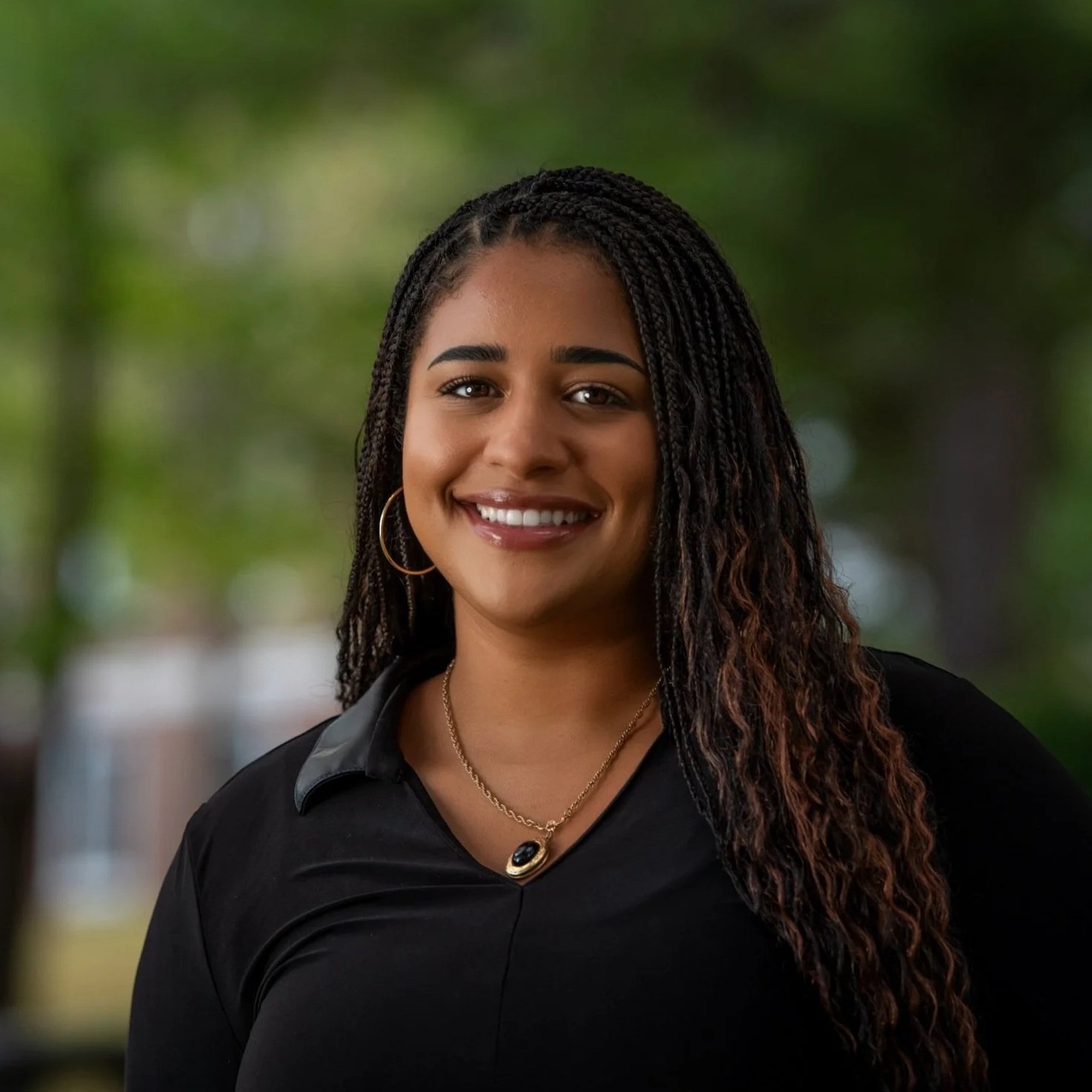 Image description: Portrait of a smiling woman with long braided hair wearing a black top and gold jewelry, standing outdoors with trees and a softly blurred background