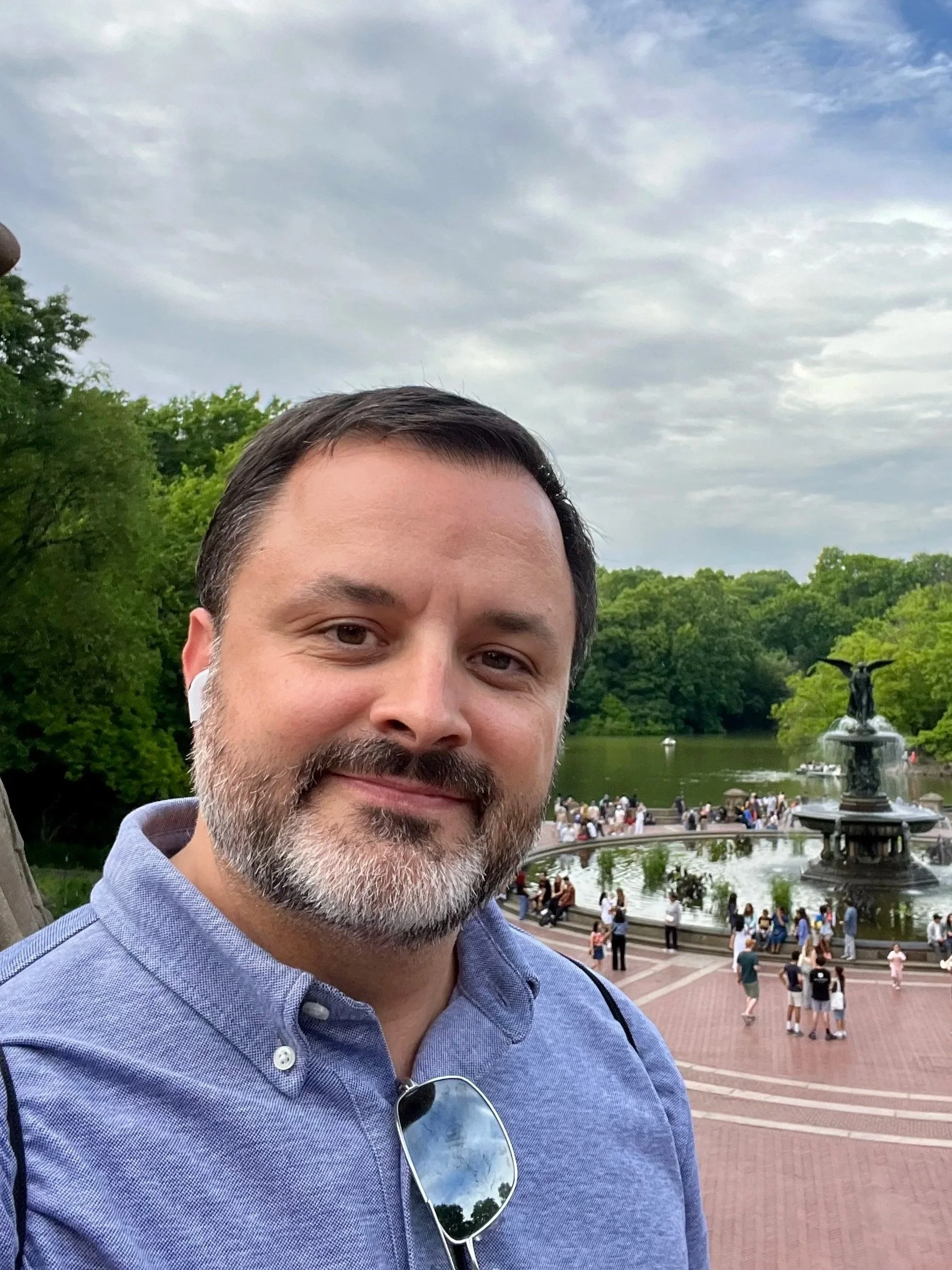 Image description: Portrait of a smiling man in a blue collared shirt in front of the Bethesda Fountain in Central Park, with trees and people in the background under a partly cloudy sky.