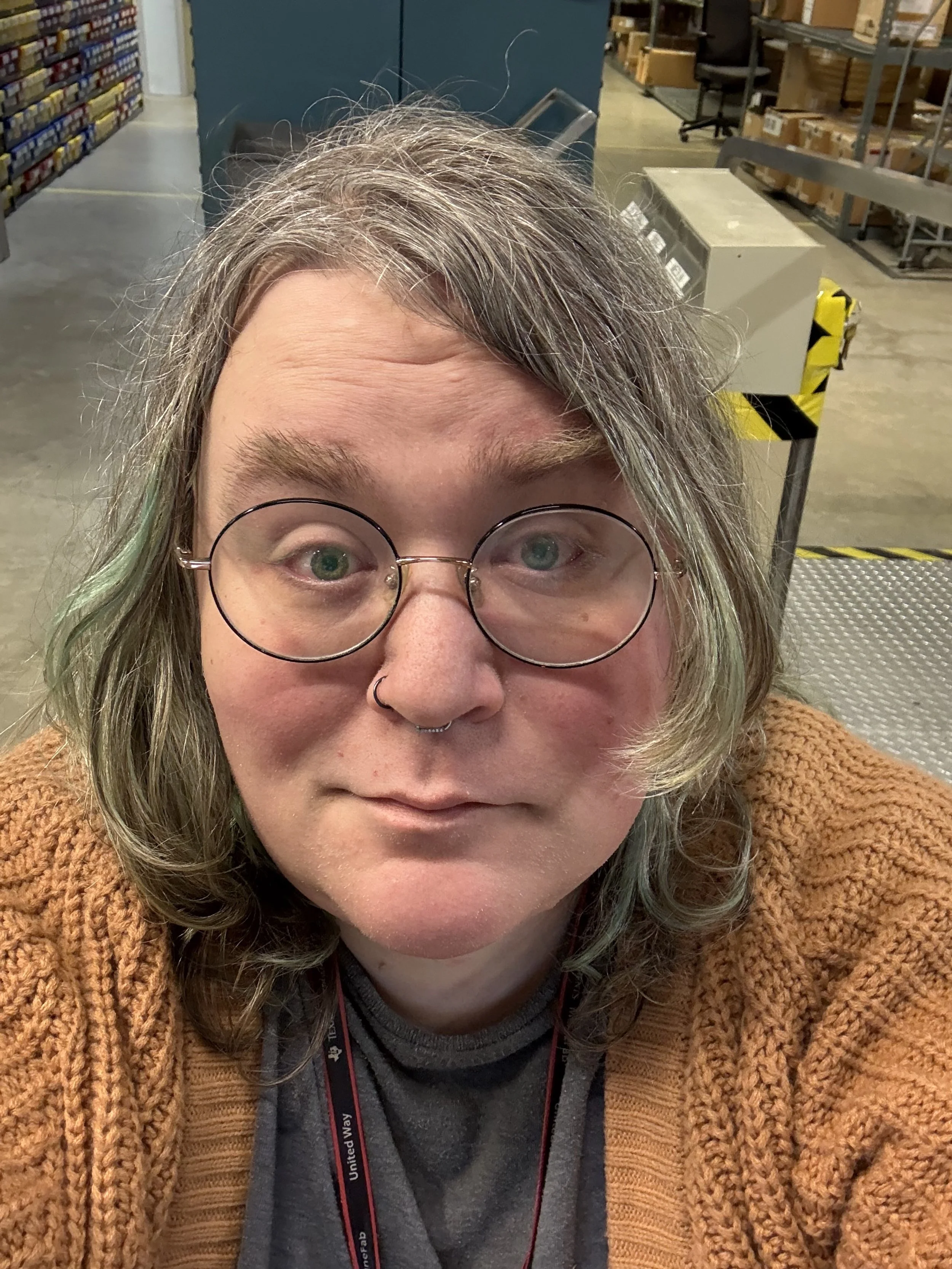 Image description: Portrait of a woman wearing round glasses and a nose ring, with shoulder-length light hair, indoors under industrial lighting.